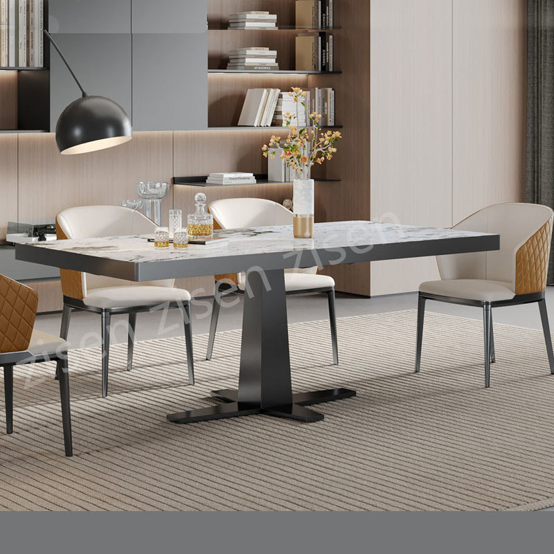 The frame insert ceramic marble dining table with a cross-shaped base is a stunning and luxurious piece of furniture that effortlessly combines different materials for a unique and sophisticated aesthetic.